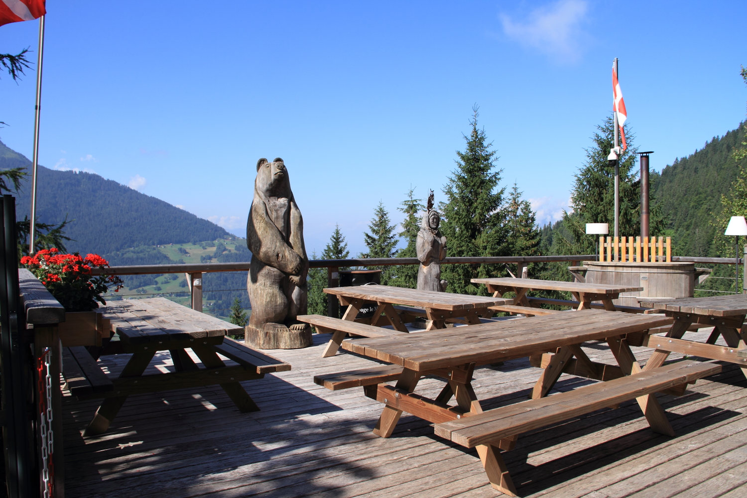L'extérieur du chalet est un véritable havre de paix. La structure en bois du chalet L’Alpage Le Moinet se fond parfaitement dans l'environnement naturel, avec des touches de fleurs colorées qui ajoutent une note vive et accueillante. Les balcons en bois sculpté, ornés de jardinières fleuries, apportent une touche de charme rustique et authentique. Les motifs d'arbres gravés dans les balustrades rappellent la nature environnante et renforcent l'atmosphère alpine.