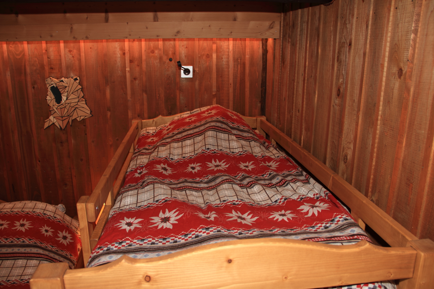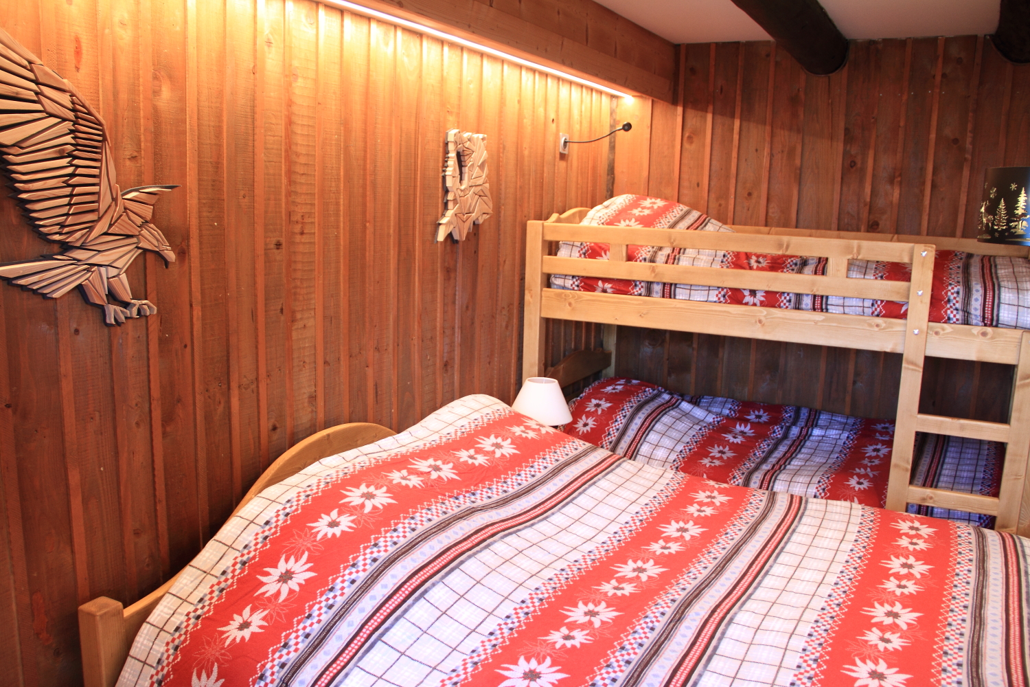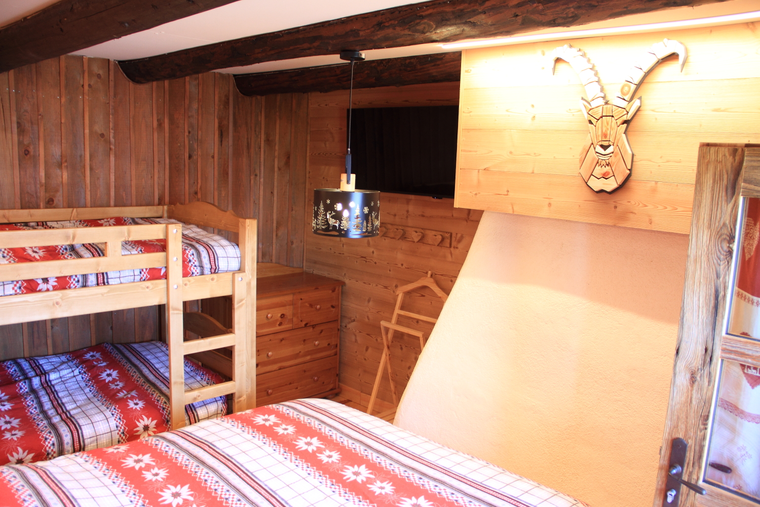 Les murs en bois sombre, les luminaires en forme de lanterne et les bandeaux LED créent une atmosphère intime et montagnarde. Pour vos soirées tranquilles, une télévision connectée est à votre disposition.