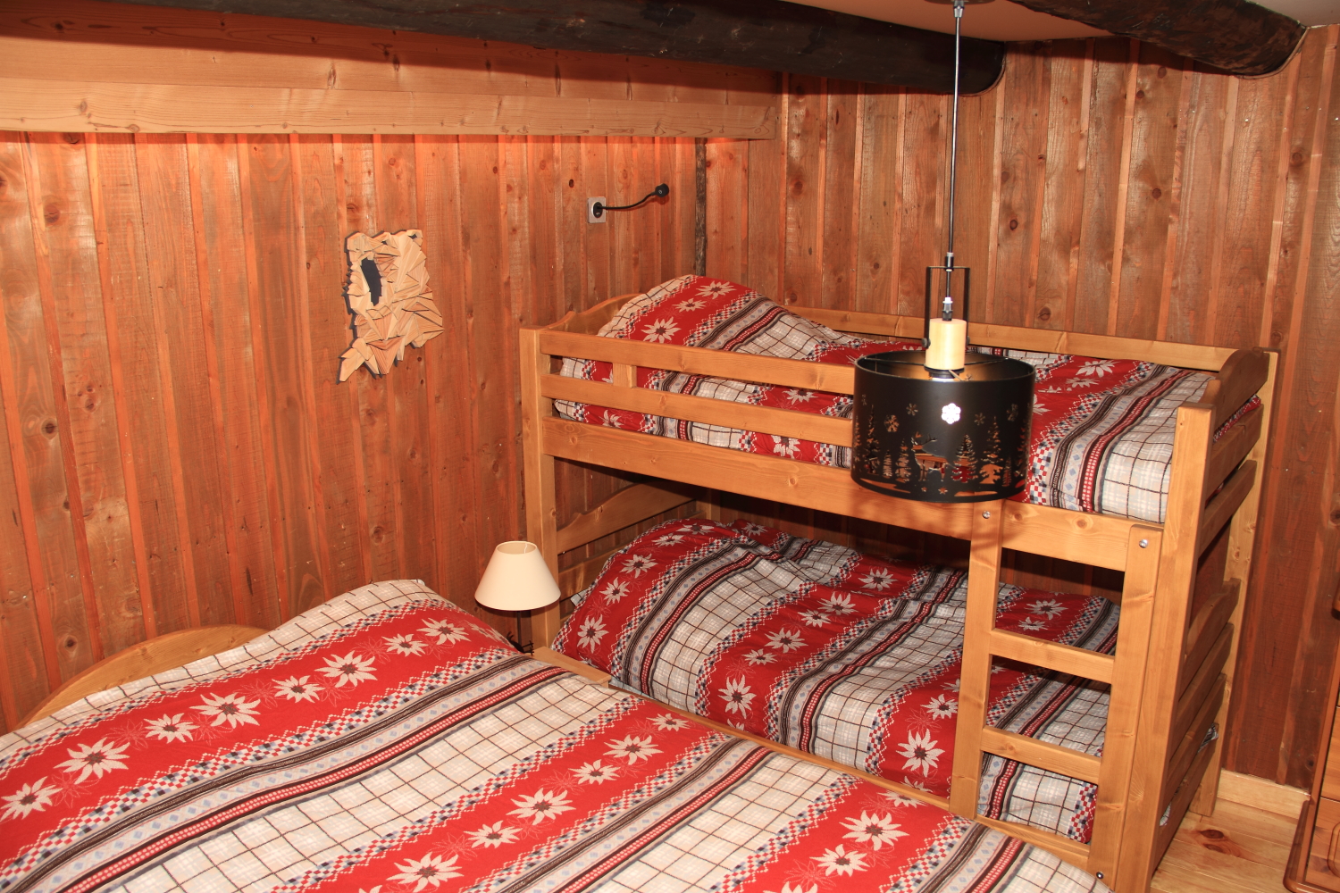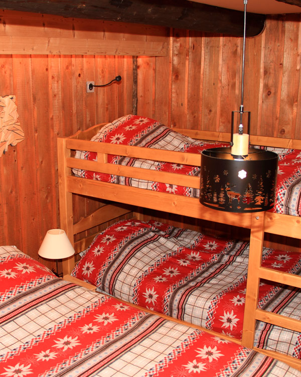 Véritable refuge alpin, la chambre Le Mirantin peut accueillir jusqu’à quatre personnes grâce à un lit double et un lit superposé. Elle fait partie des quatre chambres confortables du chalet Alpage Le Moinet, situé à Queige, dans le Beaufortain.