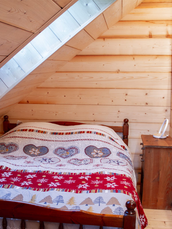 L’accès à cette chambre se fait directement depuis le balcon extérieur, offrant une belle vue sur la montagne et le grand terrain du chalet. C’est un espace discret parfait pour profiter d’un séjour ressourçant.