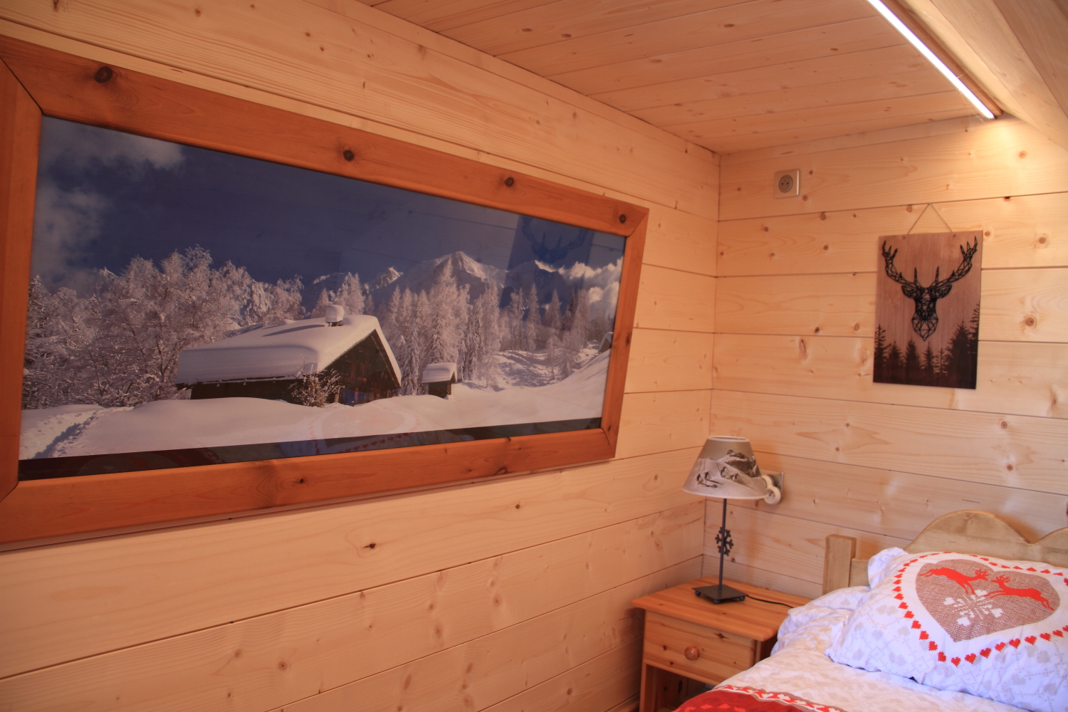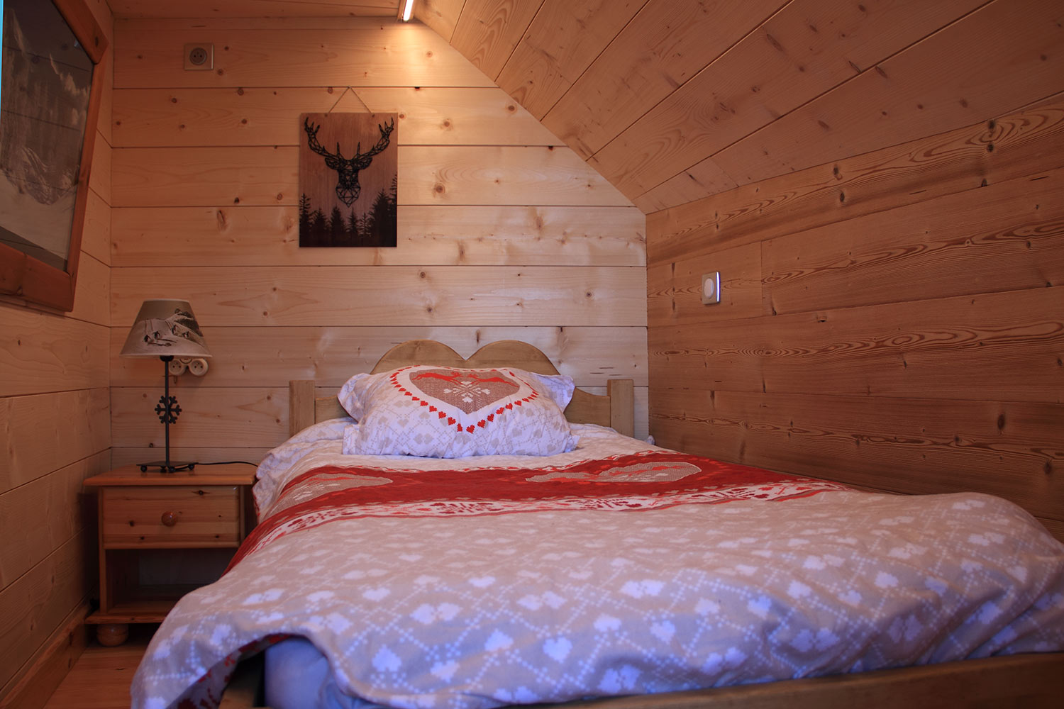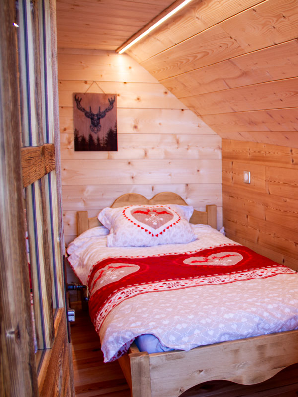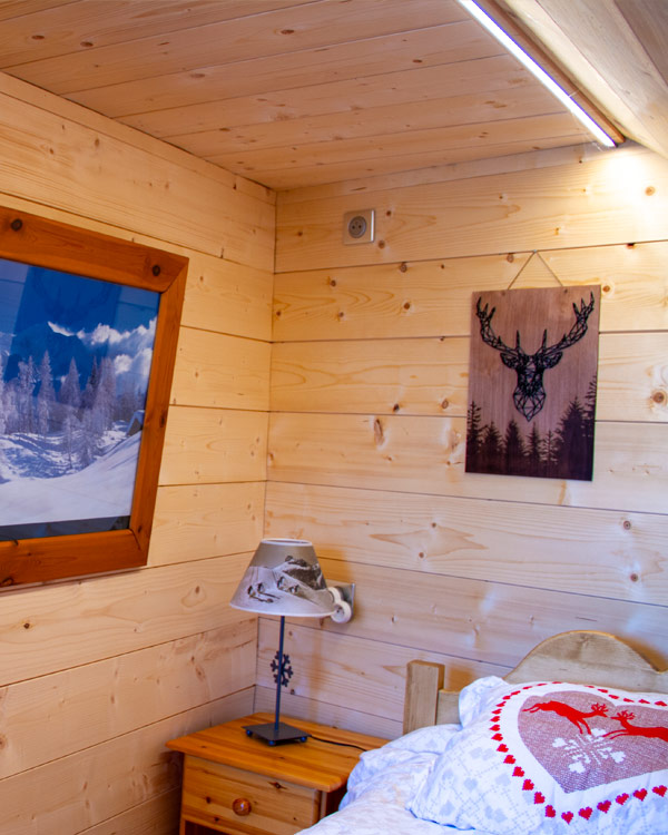 Les motifs de cœurs et de cerfs sur le linge de lit rappellent l'esprit savoyard, tandis que la lumière douce et le parfum du bois créent une ambiance apaisante, idéale pour se ressourcer après une journée en plein air.