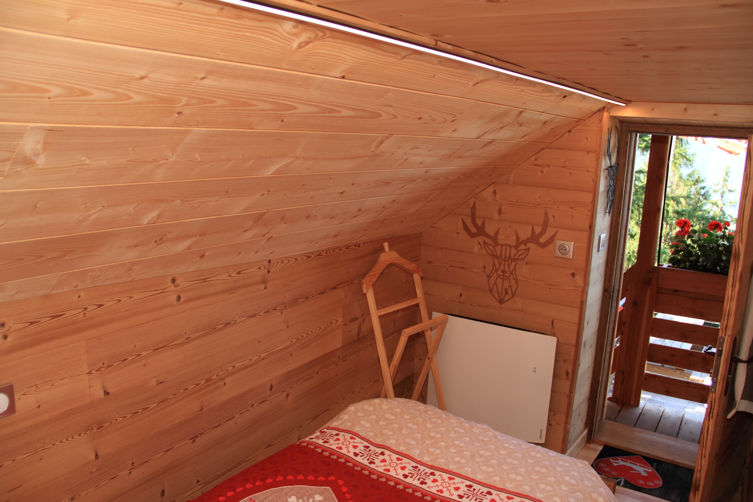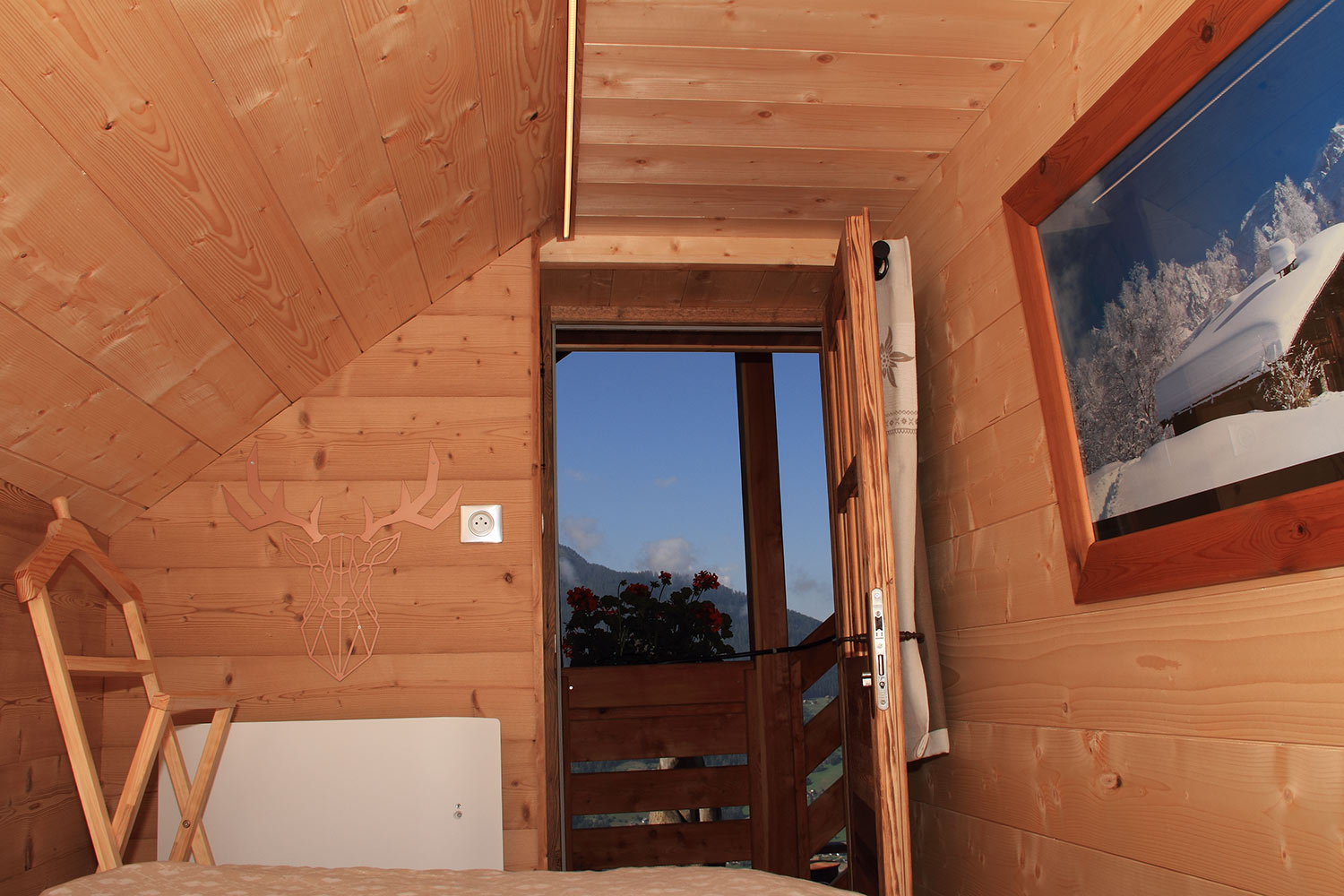 L’accès à cette chambre se fait directement depuis le balcon extérieur, ajoutant une touche d’indépendance et de charme à votre séjour au chalet Alpage Le Moinet.
